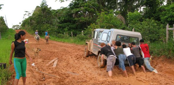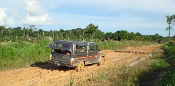Ich war ja schon fast wieder gesund, in Alex sprühte eh die Lust auf ein neues Abenteuer und so sagten wir natürlich spontan zu. Ich war damals zwar immer noch etwas geschwächt, 4 Wochen Krankheit steckten mir noch in den Beinen, aber ich kann ja auch nicht immer nur rumliegen und musste mir eben auch wieder etwas zutrauen. Als wir allerdings von der Planung hörten, wurden wir das erste Mal an diesem Wochenende kritisch: Jeder soll 10 BRL bezahlen (rund 4 €) und damit wird das Fleisch bezahlt. Im Endeffekt hat allerdings nur Alex diesen Betrag bezahlt… Sollten wir also ohne Essen loslaufen? Auf die Schnelle kauften wir mit Andreas noch 75 Brötchen, geplant waren nur 40. Für 15 Leute die 3 mal frühstücken und 3 mal zu Abend essen wollen. Gepackt war auch alles schnell, was braucht man schon in Brasilien? Ein bisschen Kleidung, ein Teller mit Besteck und Becher, Sonnencreme und Mückenschutzmittel, eine Hängematte und eine Decke. So fuhr uns Andreas mit dem Essen und unserem Gepäck zum Treffpunkt. Was uns dort erwartete, war eine ziemlich Überraschung. Es wurden Lebensmittel, Gepäck und sonstige Utensilien (Kochtöpfe, Löffel, Malsachen, …) angeschleppt wie man es in Deutschland für eine Jungscharfreizeit mit 40 Teilnehmern einpacken würde. Und kurzerhand wurde alles in den Toyota verladen - obwohl uns bewusst und klar war, dass es die Tage davor sehr arg geregnet hat und die Fazendas meist nur mit Pferd, Ochsenkarren oder einer geländetauglichen Maschine erreichbar sind. Zu dem ganzen Gepäck stopften wir noch ein paar Leute (nicht alle, manche liefen auch) in den Toyota und fuhren los. Keine 100 m aus Envira draußen sagte Andreas schon, das könnte ganz schön happig werden: Eine einzige Schlammpiste, nur unterbrochen von kurzen trockenen Abschnitten, die aber dafür mit 50cm tiefen Schlaglöchern gespickt sind. Es war, so kann man es sagen, sehr amüsant. Wenn der Dreck seitlich hochspritzt und die Reifen 20 cm tief in einer »Seifenschicht« verschwinden, dann macht es richtig Spaß. Andreas ist ein ziemlich guter Fahrer, dass musste ich anerkennend zugeben (Na gut, er lässt uns auch nicht ans Steuer…). So schlitterten wir das ein ums andere Mal über die Piste, bedrohlich nah kamen uns die Gräben oder Erdhügel rechts und links. Bis wir dann einmal steckenblieben. Doch mit einmal Vollgas vor und zurück, Gas durchdrücken und Kupplung schnell kommen lassen, schaffte es Andreas das Auto ziemlich dreckig zu spritzen und uns doch durch dieses Schlammloch durch zu kriegen. Wir kamen alles in allem gut voran. Andreas wurde vielleicht etwas übermütig und mit ziemlicher Geschwindigkeit fuhren wir einen Hügel hinunter, wir hätten auf der anderen Seite auch wieder hochwollen. Allerdings war die Senke zwischen den zwei Hügeln gefüllt mit Schlamm. Und zwar so viel Schlamm, dass wir erst einmal fast gegen einen seitlich liegenden Baumstamm geknallt wären und dann doch ziemlich genau in der Mitte in ca. 30 cm tiefen reinem Lehm-Wasser-Gemisch hängen blieben. Die Straße hatte auch noch so eine Seitenneigung, dass meine Türe aufschwang und ich fast inmitten dieser Matsche landete.