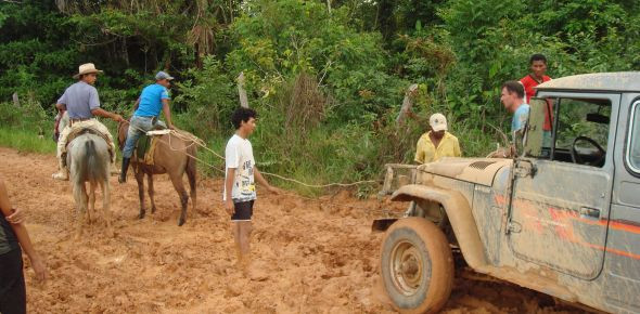Wir versuchten mit Händen und Füßen, ihn rauszuschieben. Alles, was er geladen hatte, luden wir aus um ihn leichter zu machen. Wir steckten ein paar Bretter, die am Rand lagen, unter die Reifen um so mehr Halt zu bekommen. Wir schaufelten mit den Händen den Dreck von den Reifen um irgendwie loszukommen. Aber dann… dann sprang der Motor nicht mehr an… Auch die Versuche, am Motor rumzuschrauben (man erinnert sich evtl. an früher mit Dieselpumpe) waren leider erfolglos. So standen wir, 6 km von Envira entfernt, mitten in der Pampa, zu Beginn der Dämmerung, ohne Hilfe und irgendwie verloren. Andre ging los, um nach Hilfe zu suchen und kam mit zwei Männern und einer Schaufel und einer Hacke wieder. Anspringen wollte er aber immer noch nicht. Es bestand noch die Möglichkeit ihn mit einem Ochsen heraus zu ziehen, allerdings waren die meisten Bauern gerade dabei die Ochsen und Kühe von der Weide heim zu treiben. Verloren… verloren in den Weiten des Urwaldes - das war unsere Situation. Doch zu unserer Überraschung kam zuerst ein Agraringenieur auf seinem Maulesel/Pferd von dem rechten Hügel, und keine 2 Minuten später kam ebenso einer von der linken Seite! Schnell vor das Auto gespannt, waren die Pferde von der Arbeit nicht sehr angetan… Wir schaufelten noch ein wenig herum, versuchten die Bahn zu ebnen und die Bretter möglichst sinnvoll unter die Reifen zu legen. Mit viel Körpereinsatz und einer starken Gemeinschaftsleistung (die einzige Gemeinschaft des ganzen Wochenendes…) schafften wir es langsam und in mehreren Teilschritten hievten wir den Toyota so dann doch noch aus dieser Matsche und schoben ihn soweit auf die andere Hügelseite, dass Andre im Rückwärtsrollen den Motor anlassen konnte. So wurden wir noch ein wenig weiter chauffiert, bis das nächste Schlammloch vor uns lag. Darauf wollte André sich aber nicht mehr einlassen, lud uns aus, wir bedankten uns artig und verabschiedeten ihn.