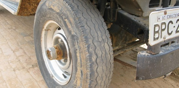 Ja, bie uns schauten aus dem Reifen auch die Drähte raus. Aber da es hier sowieso keine Polizei gibt, bzw. die besseres zu tun hat als sich um die 40 Autos in Envira zu kümmern, ist das kein Problem. Das Paradoxe an der Sache mit den Reifen ist ja auch, dass ein Satz Reifen in Envira 600 BRL (240 Euro) kostet, in Manaus aber nur 300 BRL (120 Euro). Und nach Bolivien (wenn mich nicht alles irrt) könnte man relativ kostengünstig mit Fähre und dann Autofahrt kommen und dort einen Satz Reifen für 200 BRL (80 Euro!) kaufen… Aber da es dort gerade wohl Bürgerkrieg ist, kann man nciht rüber, und hier kann man das Auto auch nicht entbehren. Wenn man die Reifen aber in Manaus kauft, dauert es sehr lange bis sie hier ankommen… Aber 600 BRL zum hier kaufen sind einfach zu teuer